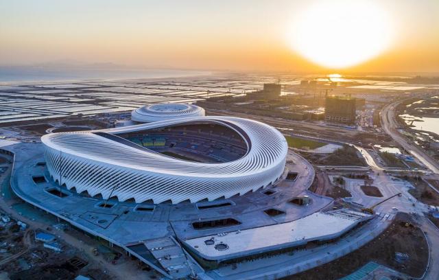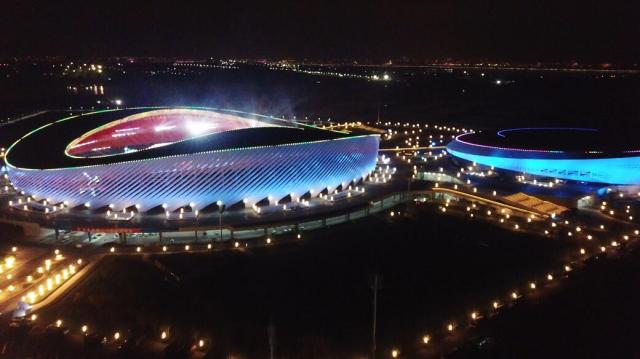 夜晚,体育场馆的绚丽灯光亮起,从空中俯瞰,一场一馆典雅端庄,体育场轻盈起伏的纹路及体育馆晶莹圆润的外形清晰可见,恰似海浪拂过的沙滩,裹藏珍珠的玉贝,简约而不失现代,震撼与温婉融为一体,成为红岛海岸边一道靓丽的风景。